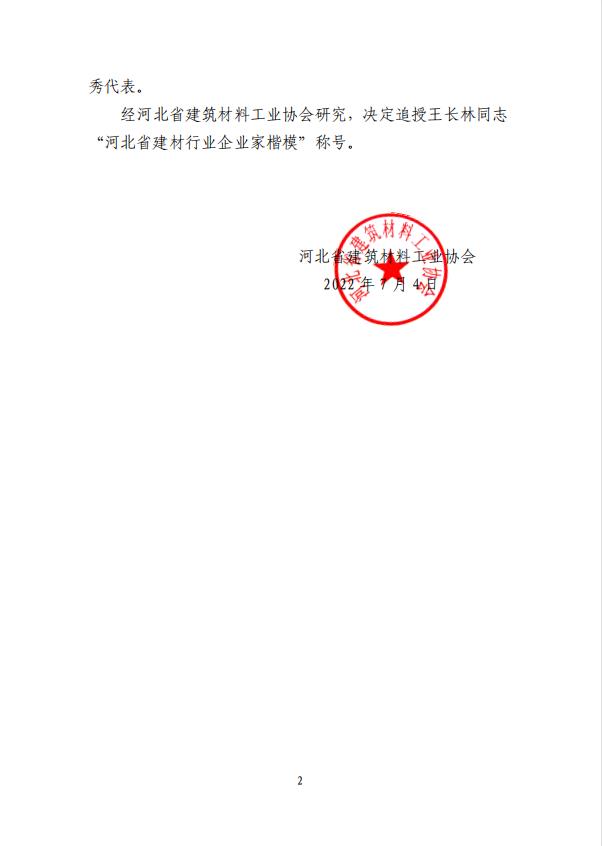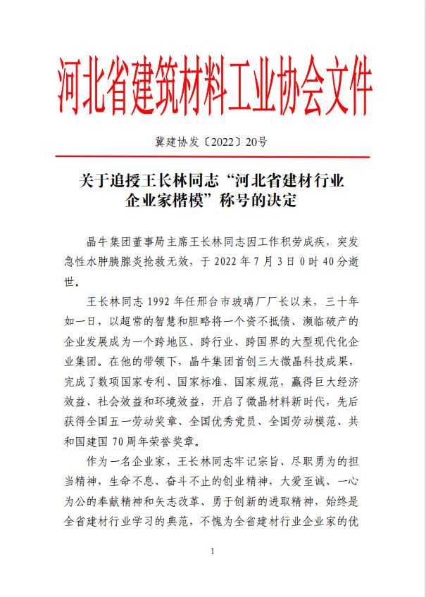 關于追授王長林同志“河北省建材行業 企業家楷模”稱號的決定